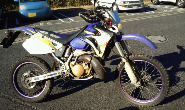 旧車XL250パリダカからいきなり当時最新のマシンに乗り換えて、しかも2ストなんでパワーがあるし軽いし速い!走るのがメチャ面白い!ある時、調子に乗って山道を攻めていたら、舗装路でしたがカーブで自爆、大いに転がって足を怪我しました。痛いわぁ~と思いながら何とか帰って、次の日病院に行くと骨にヒビが入っていたようで即ギブス巻かれました。で、バイトを一ヶ月休み・・・なんて事もありました。